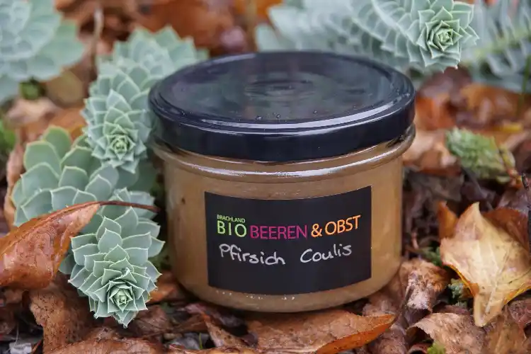 Handgemachtes Coulis aus vollreifen Demeter-Pfirsichen – weich, sonnig und aromatisch.